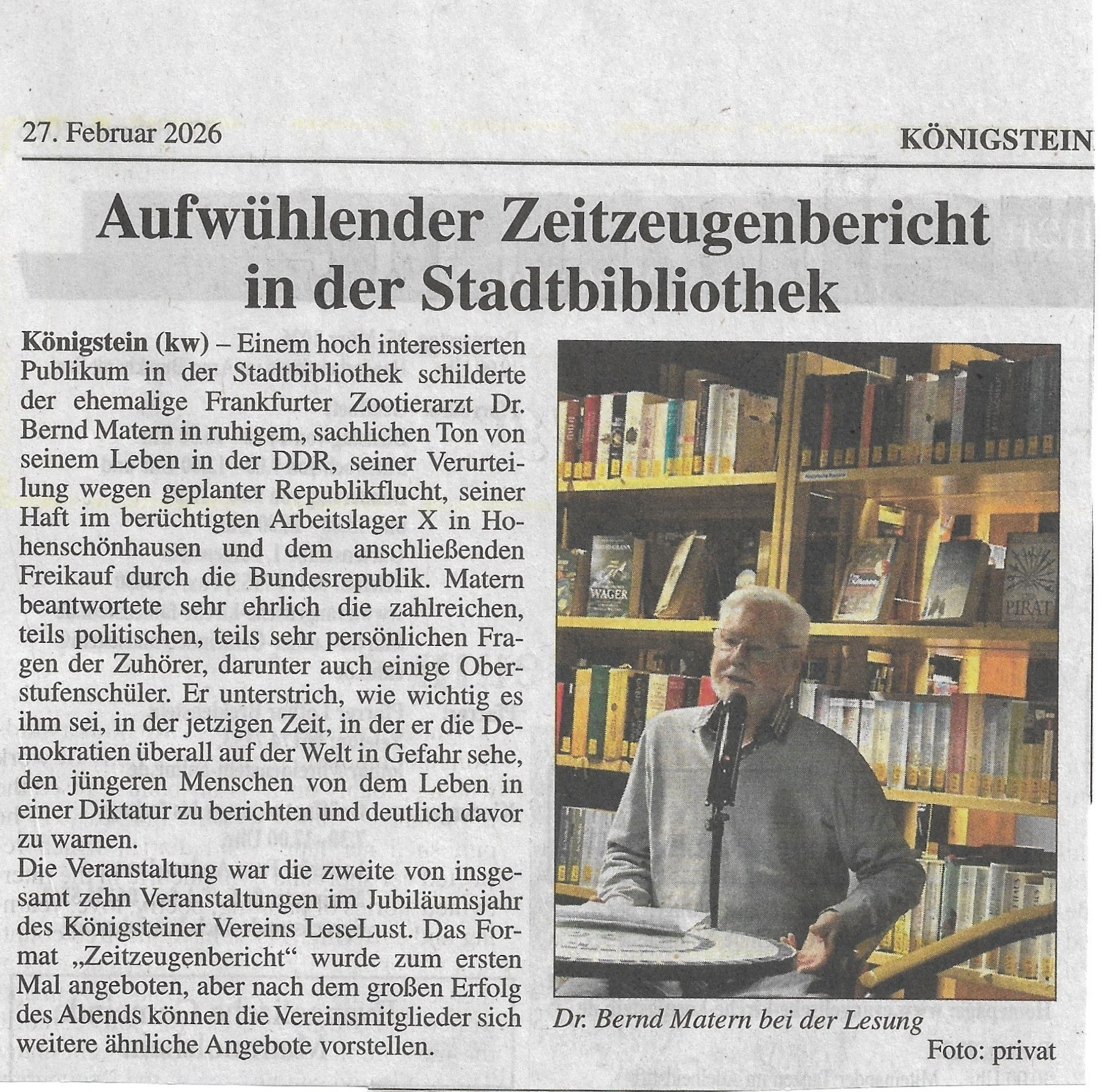 Der Verein LeseLust Königstein e.V. lud zu einem Zeitzeugenbericht mit Dr. Bernd Matern in die Königsteiner Stadtbibliothek ein.